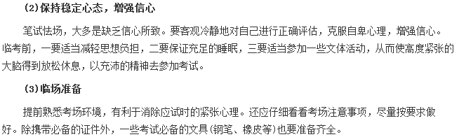 拿到試卷后,首先應通覽一遍,了解題目的多少和難易的程度,以便掌握答題的速度,然后根據先易后難的原則排出答題的順序,先攻相對簡單的題,后攻難題。這樣就不會因為攻難題而浪費時間太多,而沒有時間做會答的題,遇到較大的綜合題或論述題,則應先列出提綱。再逐條論述。在答完試卷后,要進行一次全面復查,特別注意不要漏題,跑題。要糾正錯別字,語法不通,詞不達意等錯誤。